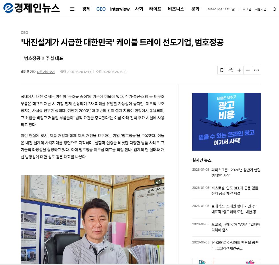TOTAL 16 16 범호정공'케이블트레이 내진 일체화 기술'재난안전신기술 지정 2025년 07월 24일 15 제주학교현장 '안전 불감' 시설 내진설계 검토 소홀 2025년 08월 07일 14 제주 주상복합 부실시공 내진 '서귀포시가 확인도 없이 준공허가' 2025년 08월 07일 13 '구조안전 및 내진설계 확인서'에 기계설비·전기설비 등 비구조요소의 내진·면진 설계가 반영됐는지 2025년 08월 07일 12 비구조요소에 대한 구조안전확인 기준(안) 2025년 09월 02일 11 지진 피해 50~90%차지 '비구조요소'부실시공 심각 현장명 생략 백지수표식 위법 서류 제출 만연 2025년 11월 03일 10 비구조요소 내진성능 검토 및 시공 방법 2025년 12월 12일 9 내진설계가 시급한 대한민국 케이블트레이 선도기업,범호정공 2026년 01월 05일 열린1페이지 2페이지 맨끝
